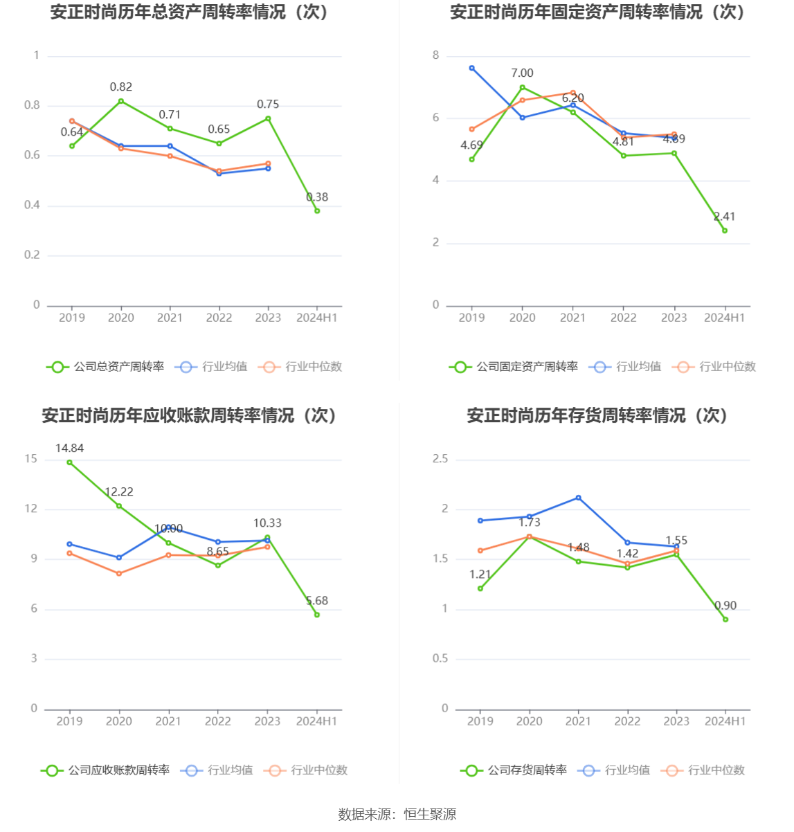 营运能力方面,2024年上半年,公司总资产周转率为0.38次,上年同期为0.46次(2023年上半年行业平均值为0.26次,公司位居同行业4/40);固定资产周转率为2.41次,上年同期为2.86次(2023年上半年行业平均值为2.51次,公司位居同行业18/40);公司应收账款周转率、存货周转率分别为5.68次、0.90次。