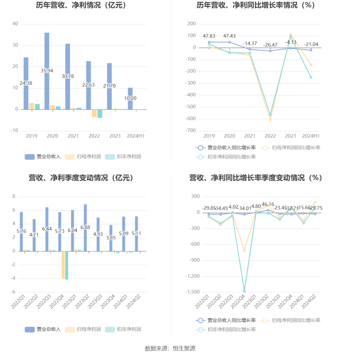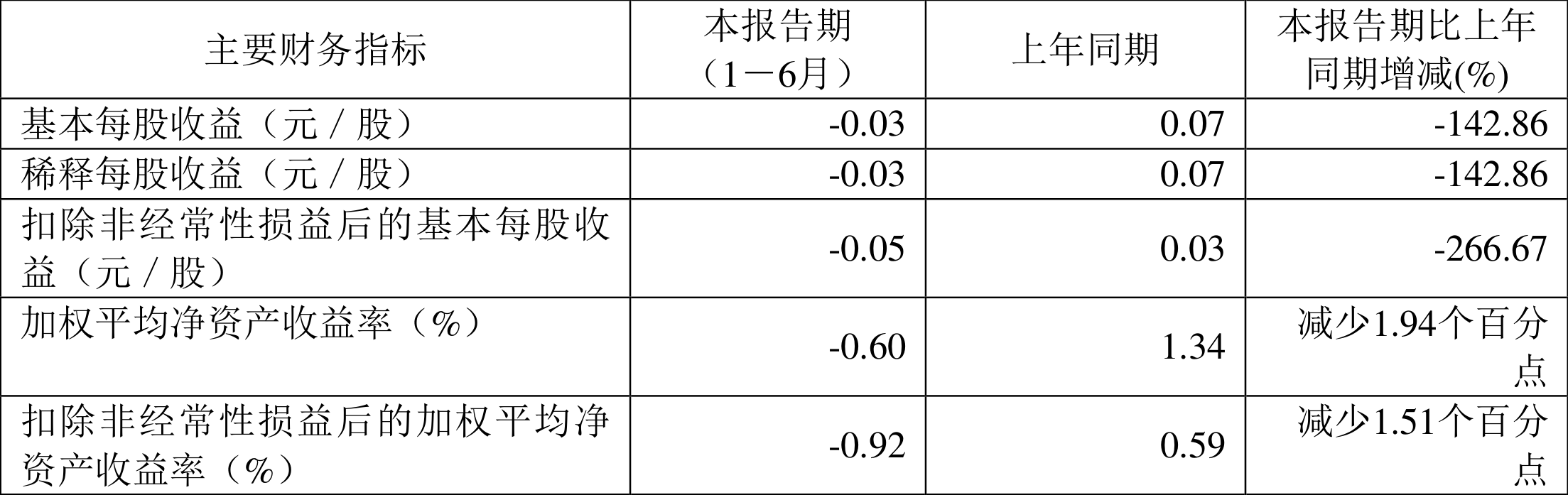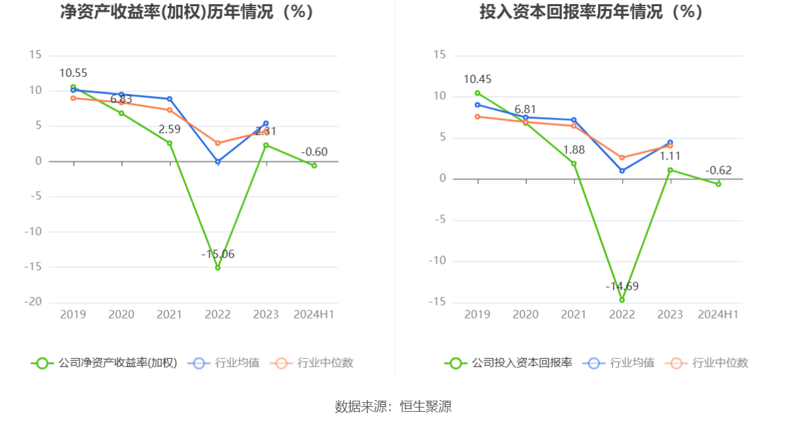 数据显示,2024年上半年公司加权平均净资产收益率为-0.60%,较上年同期下降1.94个百分点;公司2024年上半年投入资本回报率为-0.62%,较上年同期下降1.78个百分点。
