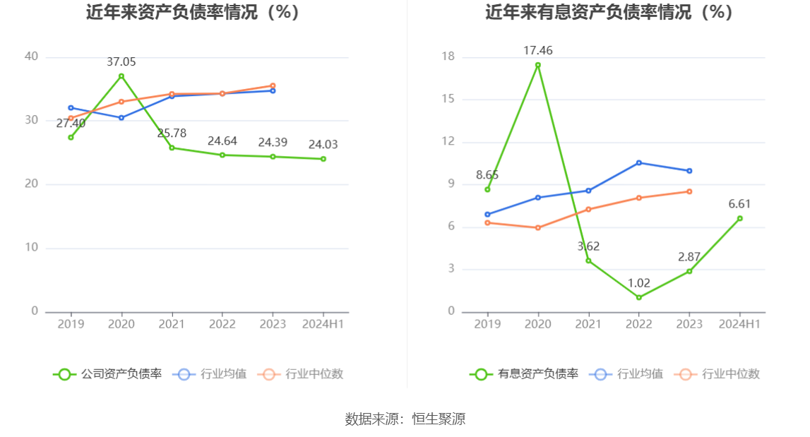 在偿债能力方面,公司2024年上半年末资产负债率为24.03%,相比上年末下降0.36个百分点;有息资产负债率为6.61%,相比上年末上升3.74个百分点。