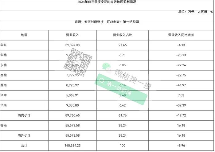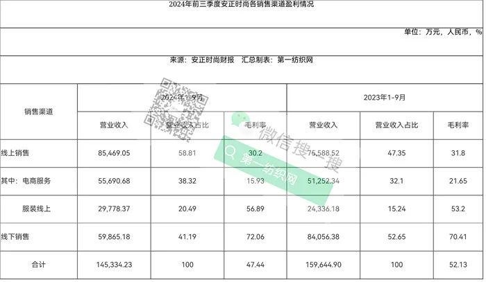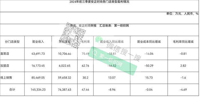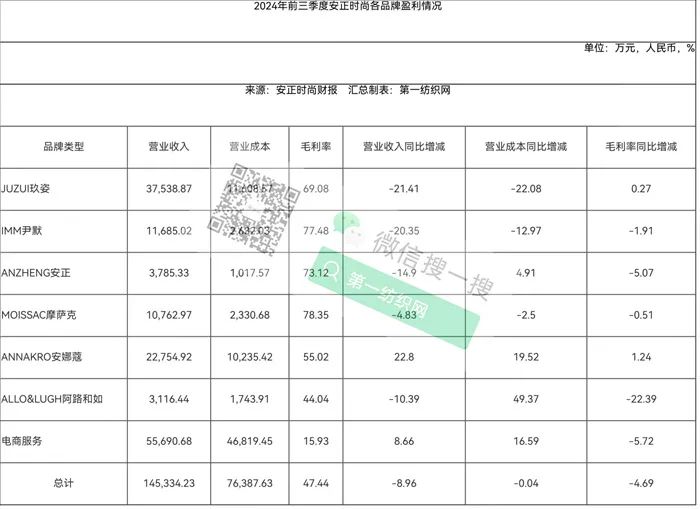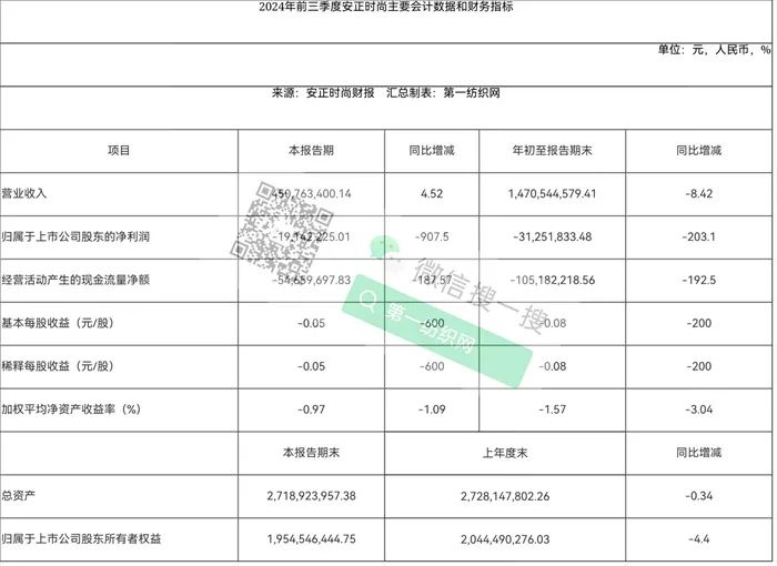 第一纺织网据今天(10月29日)晚间据安正时尚公布的财报获悉,2024年前三季度,公司实现营业收入14.71亿元,同比减少8.42%;归属于上市公司股东的净利润亏损约3125万元,同比下降203.10%,其中,三季度实现营业收入4.50亿元,同比增长4.52%;归属于上市公司股东的净利润亏损1914.22万元,同比下降907.50%。对于净利润下滑的主要原因,安正时尚解释称,主要系年初至报告期末销售同比下滑影响。
