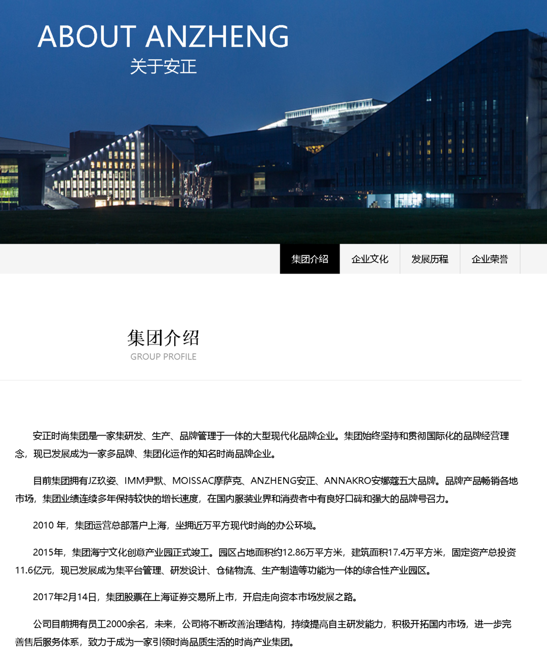 安正时尚集团是一家集研发、生产、品牌管理于一体的大型现代化品牌企业。2017年2月14日,集团股票在上海证券交易所上市(安正时尚 603839)。