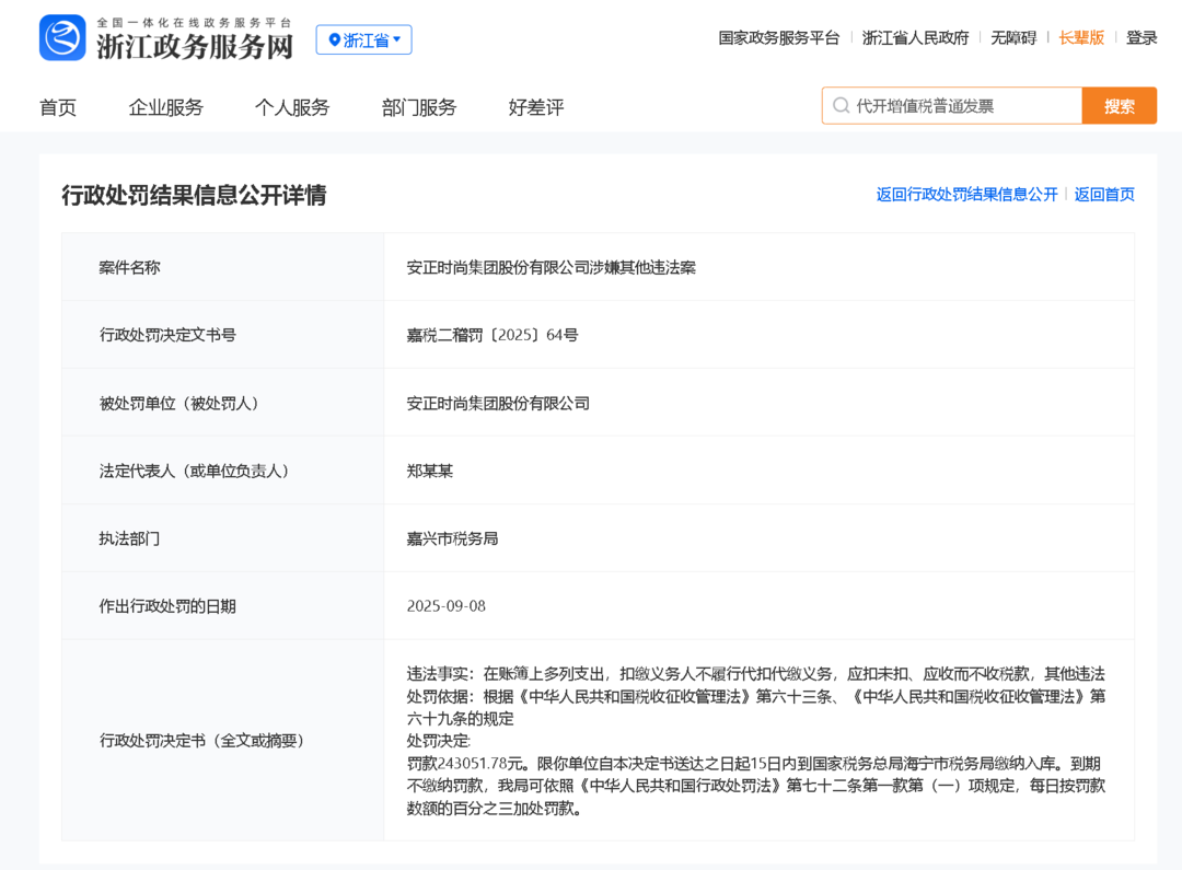 近日,齐鲁晚报·齐鲁壹点记者从浙江政务服务网行政处罚结果信息公示中获悉,安正时尚集团股份有限公司因涉嫌其他违法案,被嘉兴市税务局行政处罚。
