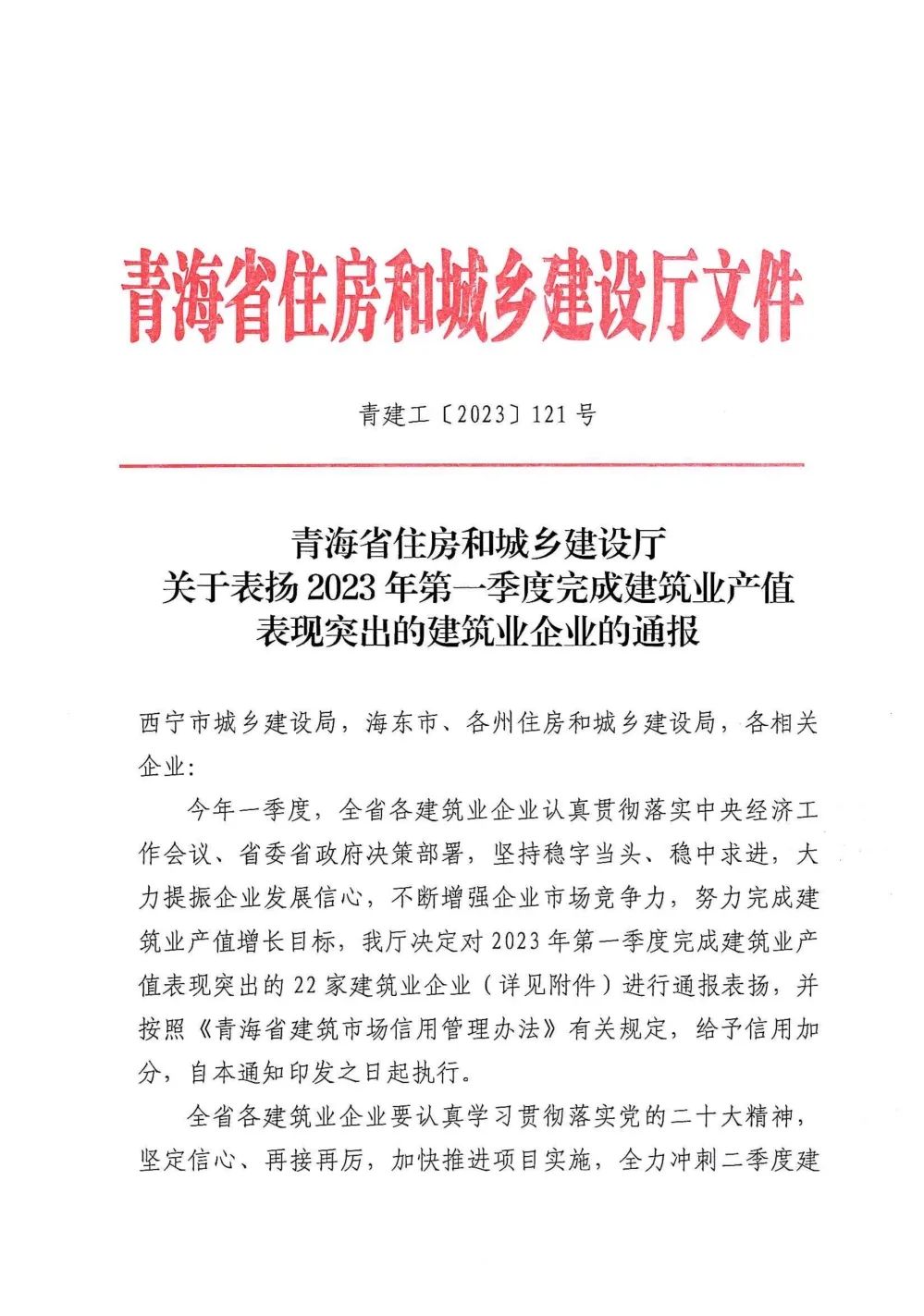 近日,青海省住房和城乡建设厅发布了《关于表扬2023年第一季度完成建筑业产值表现突出的建筑业企业的通报》,正平股份等22家企业被省住建厅评为“一季度完成建筑业产值表现突出的建筑业企业”。