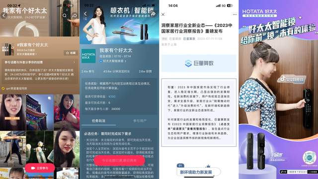 本次营销好太太除借助住小帮618资源及质造·中国家两大平台造势外,更构建起立体式营销矩阵。在抖音平台发起#我家有个好太太轻任务与挑战赛,邀约全民广泛参与,深度植入由巨量引擎发布的《2023中国家居行业洞察报告》白皮书,助力品牌打造差异化营销布局。