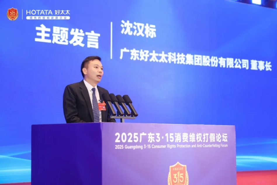 15日上午,好太太集团董事长沈汉标作为智能家居行业唯一代表在“广东3·15”论坛主会场上发言。
