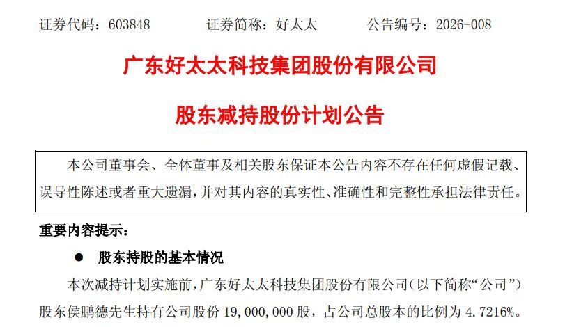 近日,好太太发布公告称,公司股东侯鹏德因个人资金需求,计划在2026年4月9日至7月8日期间,通过大宗交易和集中竞价方式合计减持不超过1207.2万股,占公司总股本比例不超过3%。以公告前一日好太太16.57元/股的收盘价计算,此番减持若能顺利实施,侯鹏德预计可套现金额约2亿元人民币。