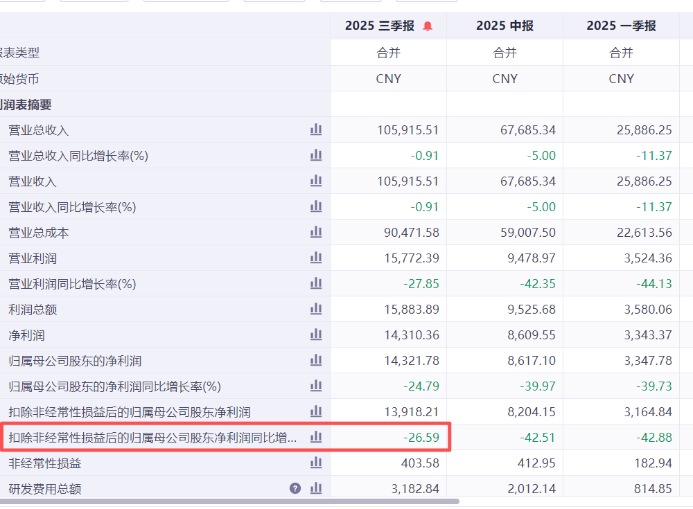 这种存银行理财与经营现金流紧张并存的现象,叠加研发投入的持续缩减令市场对公司资金使用效率及长期竞争力产生疑问。尽管2025年第三季度单季业绩有所回暖,营收和归母净利润分别同比增长7.27%和21.67%,但前三季度核心盈利指标的大幅下滑,仍显示出公司增长基础尚不牢固。