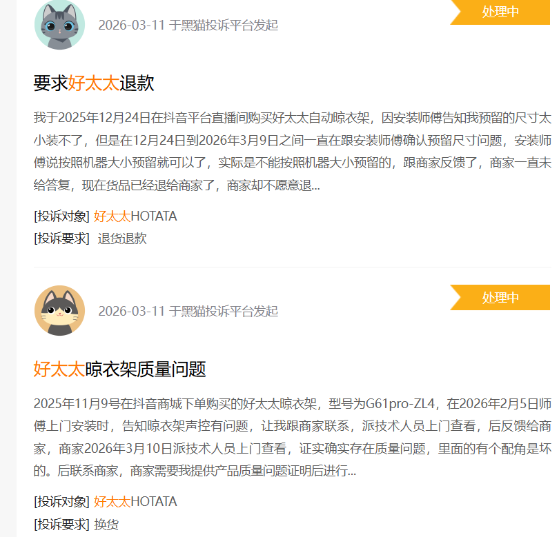 这一说法在消费者投诉平台也得到印证。在黑猫投诉平台上,关于好太太产品的投诉共3065条,主要集中在“产品质量”与“售后服务”两大痛点。有消费者投诉称,其购买的隐形电动晾衣架在5个月内维修6次仍存在故障,多次联系售后均未得到有效解决。另有消费者反映,产品过保后维修费用高昂,“换个电机就要七八百元,都快赶上半个新机了”。