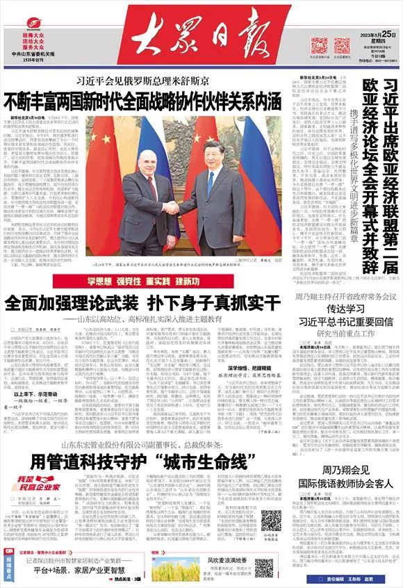 5月25日,大众日报头版“我是民营企业家”专栏以《用管道科技守护“城市生命线”》为题报道了东宏集团党委书记、东宏股份副董事长、总裁倪奉尧带领公司依靠科技创新,走出了一条产业转型升级的发展道路。