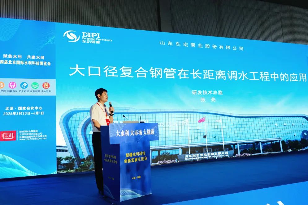 东宏股份研发中心总监张亮代表公司参加了水利科技创新发展交流会,并作《大口径复合钢管在长距离调水工程中的应用》主题演讲。他重点介绍了东宏股份在大口径复合钢管领域的生产能力、多样的市场应用场景以及在新疆地区的众多案例业绩,同时展示了公司在管道智能化方面的最新成果,获得了与会人员的广泛关注与高度认可。