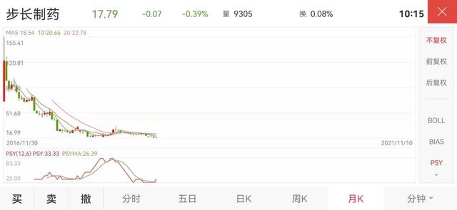 步长制药2016年上市成功,11月18日开始交易,11月29股价窜上历史高峰155.47元,从此以后,步长制药股价一泻千里跌跌不休直到今天,从A股k线日线图上,可以看出,步长制药股价在高峰之后的趋势,整体呈下降的趋势,期间虽小有反复,但是反复的高点一次比一次低,这一点从月线上看更为明显: