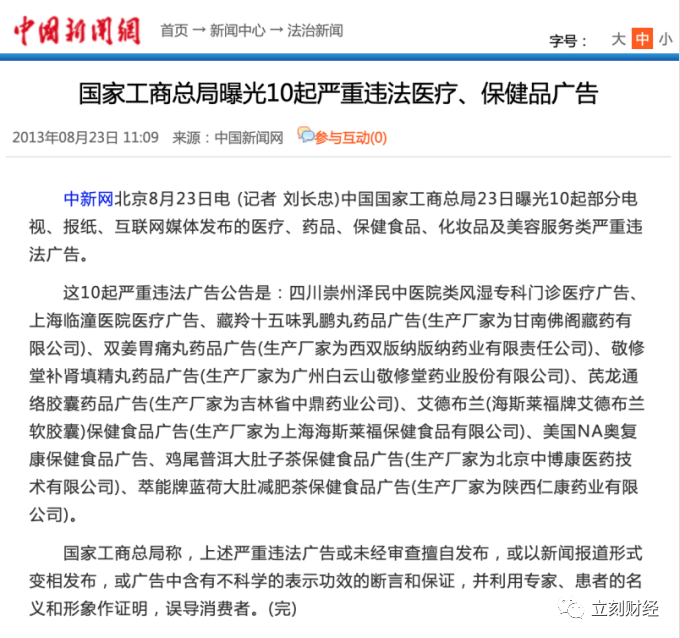 2017年8月14日,四川省食品药品监督管理局官网发布《关于严重违法广告的公告2017年第48号》查明,四川省辖区内5月份个别报刊发布的药品、保健食品广告存在任意扩大产品适应症(功能主治)范围、绝对化夸大疗效,严重欺骗和误导消费者的情形。