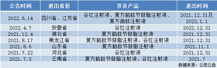 2021年7月至2022年6月,步长制药共发布了7份产品退出省级医保目录的公告,涉及的产品有谷红注射液、复方脑肽节苷脂注射液、复方曲肽注射液等。