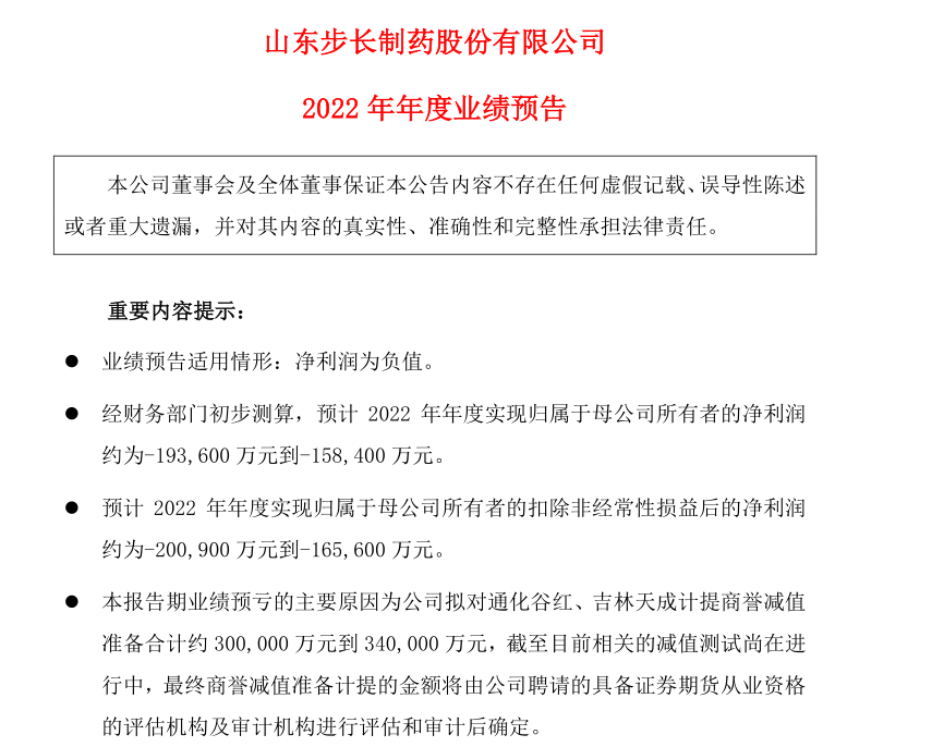 1月30日晚间,步长制药发布了其2022年度业绩预告。公司在业绩预告中称,经财务部门初步测算,预计2022年年度实现归属于母公司所有者的净利润约为-193,600万元到-158,400 万元。预计2022年年度实现归属于母公司所有者的扣除非经常性损益后的净利润约为-200,900万元到-165,600 万元。