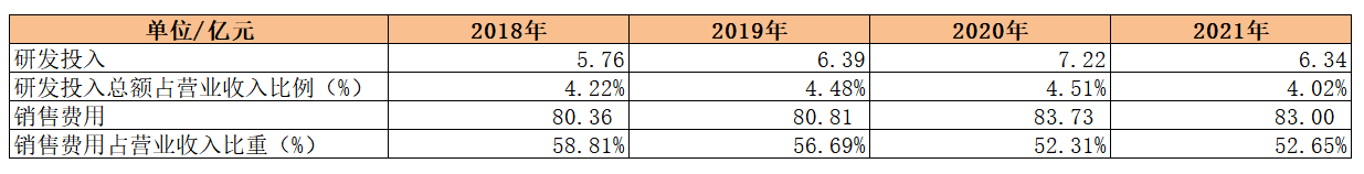 虽然,步长制药开始发力研发,但在研发上投入并未大幅增长。与2018年5.76亿的研发投入相比,2021年步长制药的研发投入仅增加了0.58亿;而同期的销售费用增加了3亿。