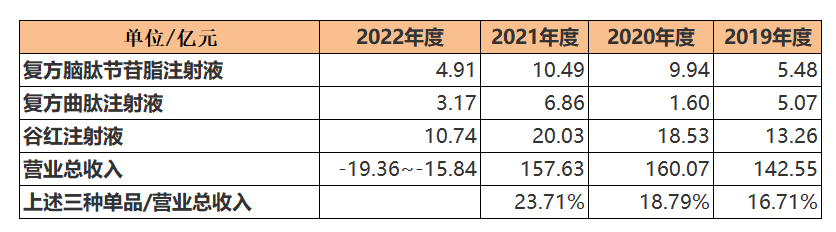 据回复函披露数据,2022年复方脑肽节苷脂注射液、复方曲肽注射液及谷红注射液实现收入较2019年时分别减少了10.4%、37.6%及19%。