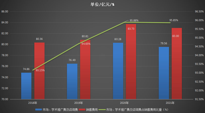 在步长制药历年销售费用中,尤以市场、学术推广费及咨询费为主。2018—2021年,市场、学术推广费及咨询费占销售费用比重均在90%以上且逐年上升。