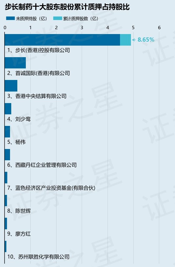 截止本公告日,股东步长(香港)控股有限公司已累计质押股份4248.0万股,占其持股总数的8.65%。本次质押后步长制药(603858)十大股东的累计质押股份占持股比例见下图: