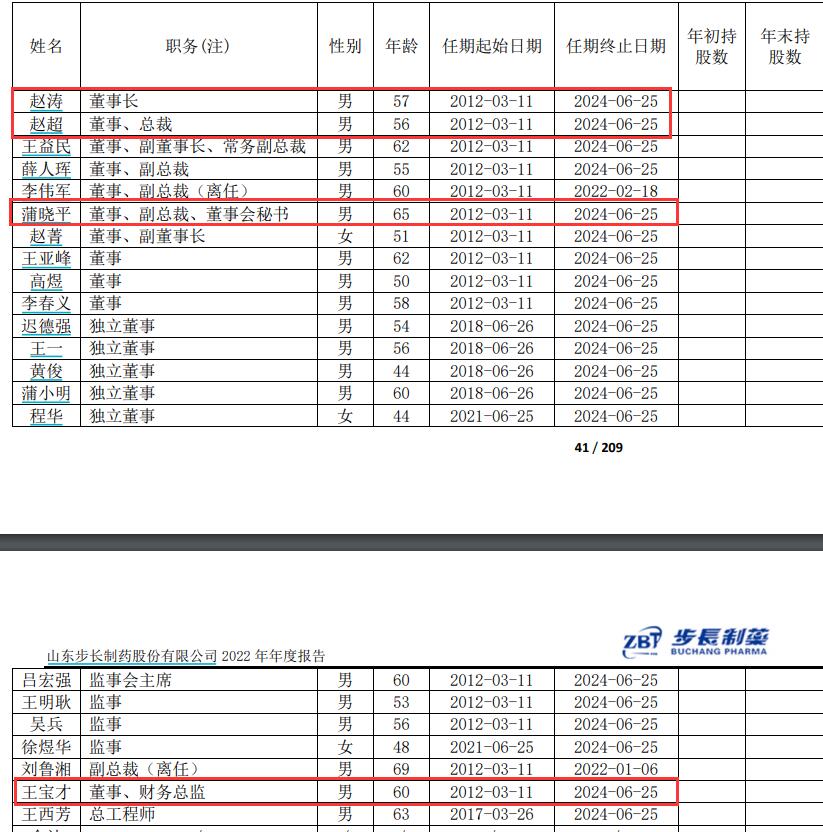 步长制药2022年年报显示,赵涛为公司董事长,赵超为董事、总裁,蒲晓平为董事、副总裁、董事会秘书,王宝才为董事、财务总监。上述四人任期均为2012年3月11日至2024年6月25日。