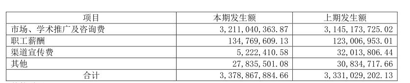 具体从“市场、学术推广及咨询费”的构成来看,包括市场活动费31.51亿元、市场调研费13.95亿元、学术活动费16.27亿元、学术交流费9.50亿元。