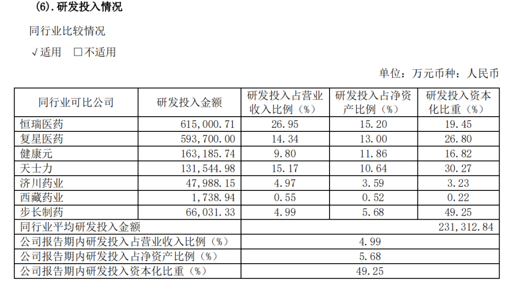2023年,步长制药的研发费用为3.35亿,同比增长17.94%,只有同期销售费用的5.26%,占总营收的比重仅有4.99%,这一占比情况在步长制药公布的可比公司对比中,排在倒数第三位,具体投入金额不及行业平均水平的15%。