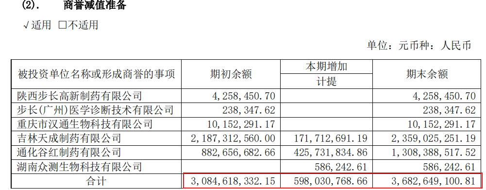2012年,彼时尚未上市的步长制药开始对吉林天成和通化谷红进行收购,直到2015年才100%控股通化谷红、收购吉林天成95%的股权,收购成本分别为27.48亿元和35.97亿元,确认商誉分别为18.36亿元、31.61亿元。