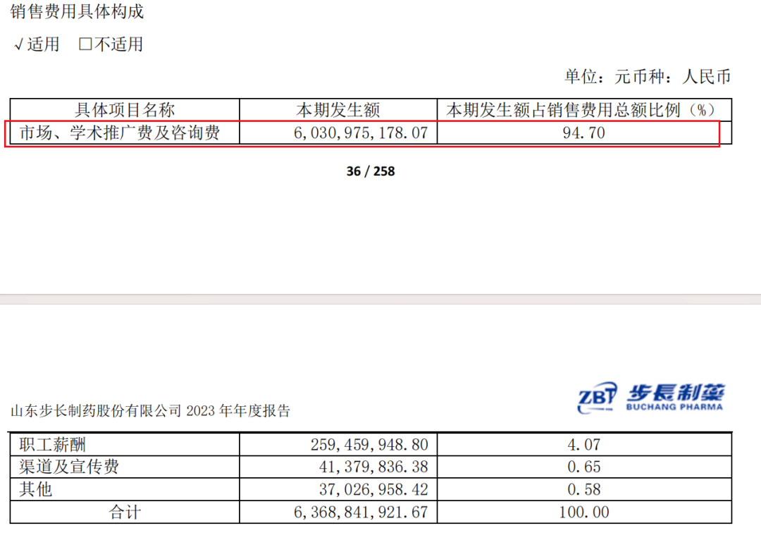 财报显示,步长制药的高销售费用,绝大部分都投向了“市场、学术推广费及咨询费”。去年步长制药63.68亿元的销售费用中,市场、学术推广费及咨询费占比达94.70%,共计60.3亿,平均每天花费1652万。尽管相比2022年已经收窄了不少,但销售费用依旧占公司营收的48.08%,远超同行可比公司。