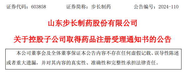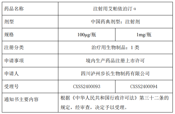 山东步长制药股份有限公司(以下简称“公司”)近日获悉,公司控股子公司四川泸州步长生物制药有限公司的“注射用艾帕依泊汀α”药品注册上市许可申请获国家药品监督管理局的受理,并收到《受理通知书》。现将有关信息披露如下: