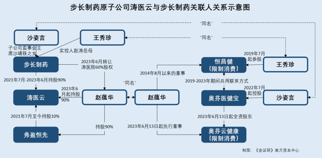 综合而言,2021年,步长制药与由赵蕴华担任执行事务合伙人且持股90%的弗盈恒先,设立控股子公司涛云医,彼时步长制药对涛云医持股90%,弗盈恒先对涛云医持股10%。两年后即2023年6月,步长制药称因涛医云开发系统耗时耗资造成连续亏损将其90%控股权,以1元价格将涛医云转让给赵蕴华。