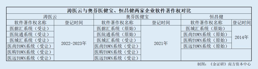 值得留意的是,奥芬医健宝健康科技(北京)有限公司(以下简称“奥芬医健宝”)同样于2021年6月登记并原始取得的6项软件著作权,及东亚奥芬(北京)网络技术服务有限公司(现已更名为北京恒昌健科技集团有限公司,以下简称“恒昌健”)于2014年登记并原始取得的4项软件著作权,与涛医云的软件系统名称重叠。