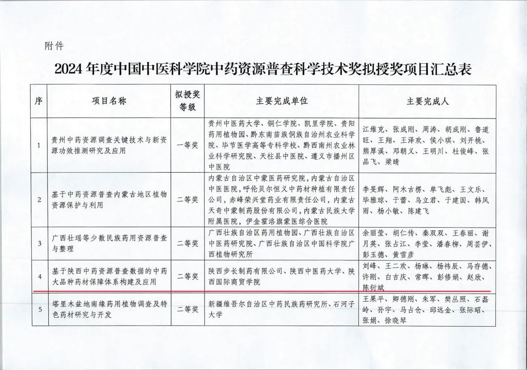 近日,中国中医科学院发布《关于对2024年度中国中医科学院中药资源普查科学技术奖拟授奖项目进行公示的通知》,陕西步长制药有限公司、陕西中医药大学、陕西国际商贸学院联合申报的“基于陕西中药资源普查数据的中药大品种药材保障体系构建及应用”荣获二等奖。