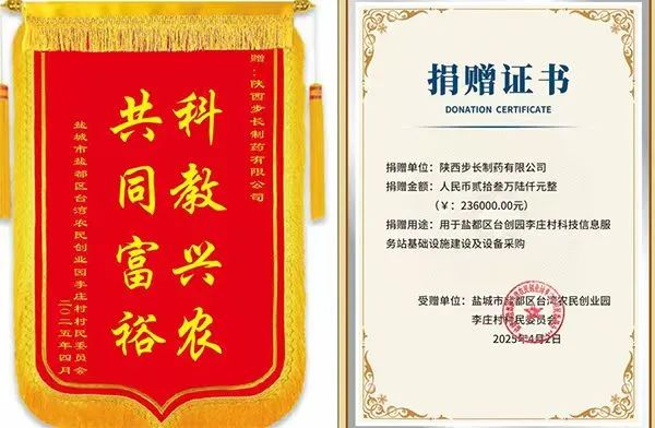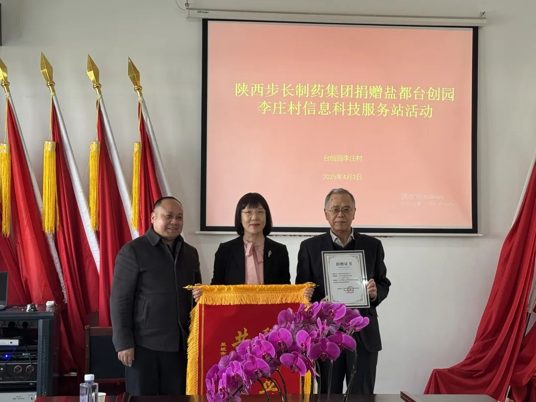 2025年4月2日,步长制药捐助江苏盐城市盐都区台创园李庄村科技信息服务站落成仪式在李庄村召开。原陕西省委统战部部长李锦江、台创园党工委书记宋鹏程、李庄村书记商文荣及村民代表、步长制药驻江苏各办经理出席捐助仪式,步长制药综合管理中心总经理雷雅麟、企业文化教育中心总监贾舰轲代表公司终身荣誉董事长赵步长教授、公司总裁赵超博士出席会议。