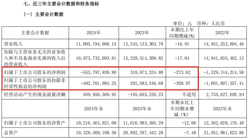 年报显示,2024年公司实现营业收入110.06亿元,同比下降16.91%,为连续第四年下滑。同期,公司归母净利润为-5.54亿元,同比下降273.62%;扣非净利润为-4.93亿元,同比下降268.97%。