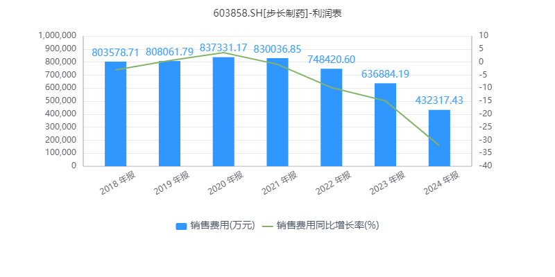 值得注意的是,2024年,步长制药的销售费用为43.23亿元,研发费用为3.45亿元。