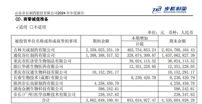 根据2024年报披露,步长制药对通化谷红、吉林天成累计计提的商誉减值准备金额分别为28.25亿元、16.37亿元,两者剩余仍未计提的商誉分别还有3.36亿元、1.99亿元,这些商誉未来是否仍存在减值风险,仍值得继续关注。