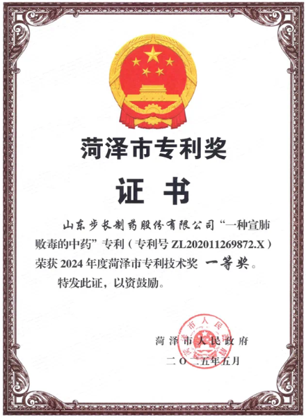 菏泽市专利奖是根据《菏泽市专利奖励办法》,在各级政府部门大力支持下为全面实施创新驱动发展战略,推动菏泽市创新活动开展,鼓励和调动企事业单位和个人发明创造积极性举办的专利奖评审活动。此次山东步长制药申报的专利ZL202011269872.X是宣肺败毒颗粒产品的核心专利。宣肺败毒颗粒是山东步长制药针对《新型冠状病毒感染诊疗方案》重大需求研制的经典名方中药制剂,成功入选国家推荐《新型冠状病毒感染诊疗方案》疫情防控的“三药三方”,在疫情防控中发挥了重要作用。目前该产品已被列入《新型冠状病毒感染诊疗方案》(试行第六-第十版);在《慢性阻塞性肺疾病中西医结合管理专家共识》(2023版)中,宣肺败毒颗粒被推荐用于治疗慢阻肺急性加重期引起的咳嗽、咳痰、喘憋等;《2023年春季成人流行性感冒中医药防治专家共识》也将其列为流感热毒蕴肺证治疗的推荐药物;2023年,在国医大师晁恩祥、邬堂春教授等专家指导下,综合全国66位一线临床专家的征询意见,形成了《宣肺败毒颗粒临床应用专家共识》,该共识也明确指出,宣肺败毒颗粒适用于所有湿毒郁肺的呼吸道感染疾病。