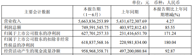 步长制药(603858.SH)近日披露的2025年半年度报告显示,公司上半年实现营业收入56.64亿元,同比增长4.27%;归属于上市公司股东的净利润6.28亿元,同比增长171.24%;归属于上市公司股东的扣除非经常性损益的净利润6.19亿元,同比增长180.04%;经营活动产生的现金流量净额9.59亿元,同比增长92.87%。