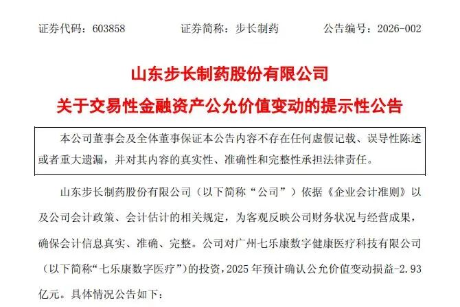 步长制药表示,本次预计确认的公允价值变动损益-2.93亿元,将减少公司2025年度归母净利润2.93亿元。根据《公开发行证券的公司信息披露解释性公告第1号》相关规定,本次公允价值变动损益属于非经常性损益,可予以扣除,不影响公司2025年度扣非后净利润。