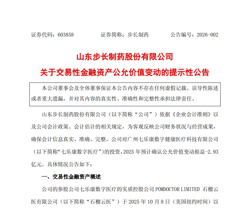 2026年1月6日,步长制药发布公告称,参股公司七乐康数字医疗(下称“七乐康”)实质控股公司石榴云医于2025年10月8日在美国纳斯达克上市。截至2025年9月30日,对七乐康数字医疗投资账面价值为3.26亿元,截至2025年12月31日,持有对应股权市值为3307.91万元,预计确认公允价值变动损益-2.93亿元,将减少2025年度归母净利润2.93亿元,不影响扣非后净利润。最终数据以经审计的2025年年度报告为准。