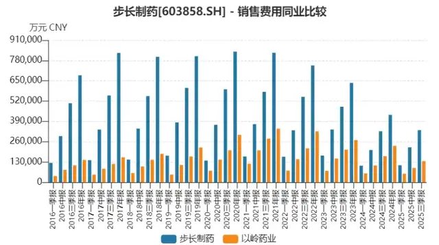 在费用端,步长制药自成立以来的“老问题”尚未根本解决:2024年销售费用高达43.23亿元,占营收比例约39%,虽较2021年的53%有所下降,但依然明显高于行业平均水平;销售费用占比长期远超研发费用,公司增长模式仍高度依赖营销驱动。
