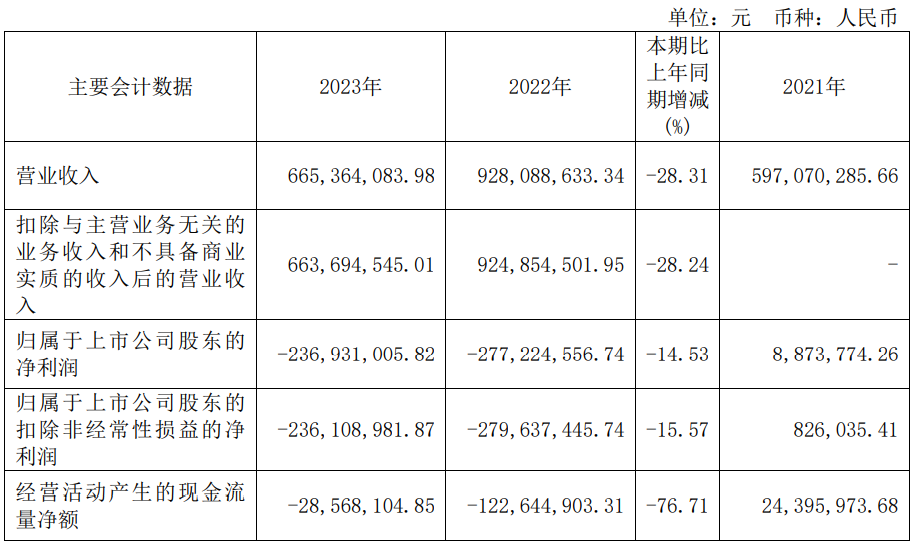 松炀资源(603863.SH)昨日公布2023年年度报告,公司去年实现营业收入6.65亿元,同比下降28.31%;归属于上市公司股东的净利润-2.37亿元,上年为-2.77亿元;归属于上市公司股东的扣非净利润-2.36亿元,上年为-2.80亿元;经营活动产生的现金流量净额-2856.81万元,上年为-1.23亿元。
