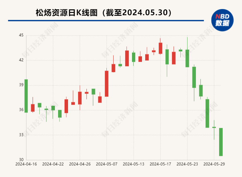 《每日经济新闻》记者注意到,松炀资源在5月22日发布购买实控人相关资产的公告,随即收到了上交所问询函,5月23日起便遭遇股价连续大跌,6个交易日内股价已由44元/股左右下探至30元/股附近。