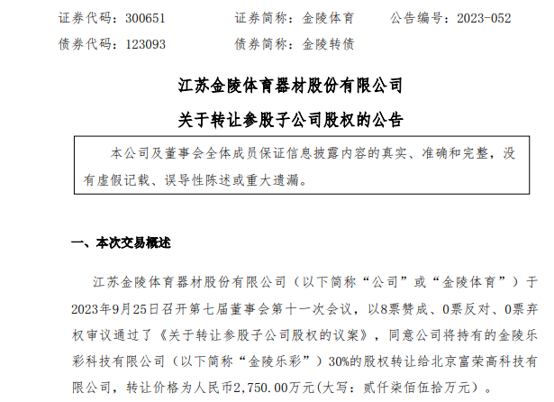 记者查询发现,2023年9月25日晚,金陵体育宣布出售其持有的金陵乐彩30%股权,交易对方即富荣高科,转让价格为2750万元。