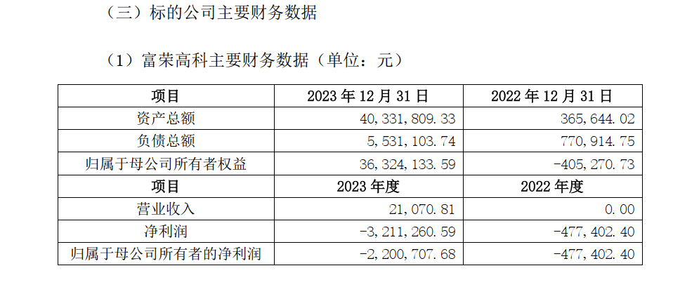 根据公告,富荣高科2022年尚无收入,归母净利润亏损47.74万元,2023年实现收入2.1万元,归母净利润亏损220万元,其主要持有金陵乐彩65%股权,为金陵乐彩的控股股东,未开展其他经营业务。