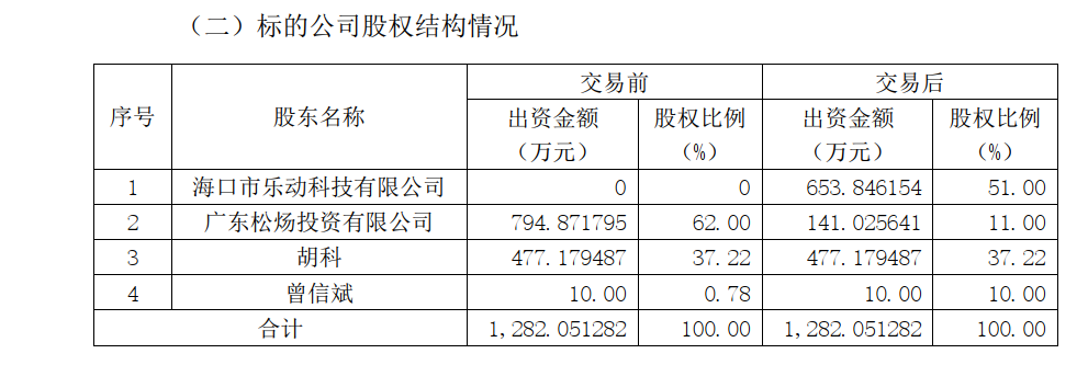 交易前,王壮鹏通过全资持股的广东松炀投资有限公司(以下简称松炀投资)持有富荣高科62%股权;若交易完成,乐动科技将直接持有富荣高科51%股权,成为富荣高科的控股股东,松炀投资对富荣高科的持股比例将降至11%。