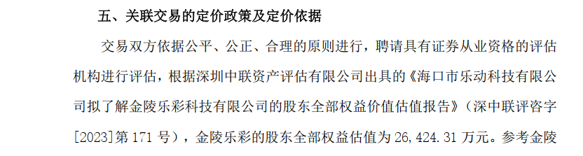 值得注意的是,松炀资源目前所持有的金陵乐彩20%股权,同样来自2023年9月25日晚宣布的交易。当时松炀资源称,前期乐动科技曾计划以5000万元对南焜实业(深圳)有限公司(以下简称南焜实业)进行增资,但协商变更为向南焜实业收购其所持金陵乐彩20%股权,价格依旧是5000万元。根据当时深圳中联资产评估有限公司出具的评估报告(深中联评咨字[2023]第171号),金陵乐彩的股东全部权益估值为2.64亿元。