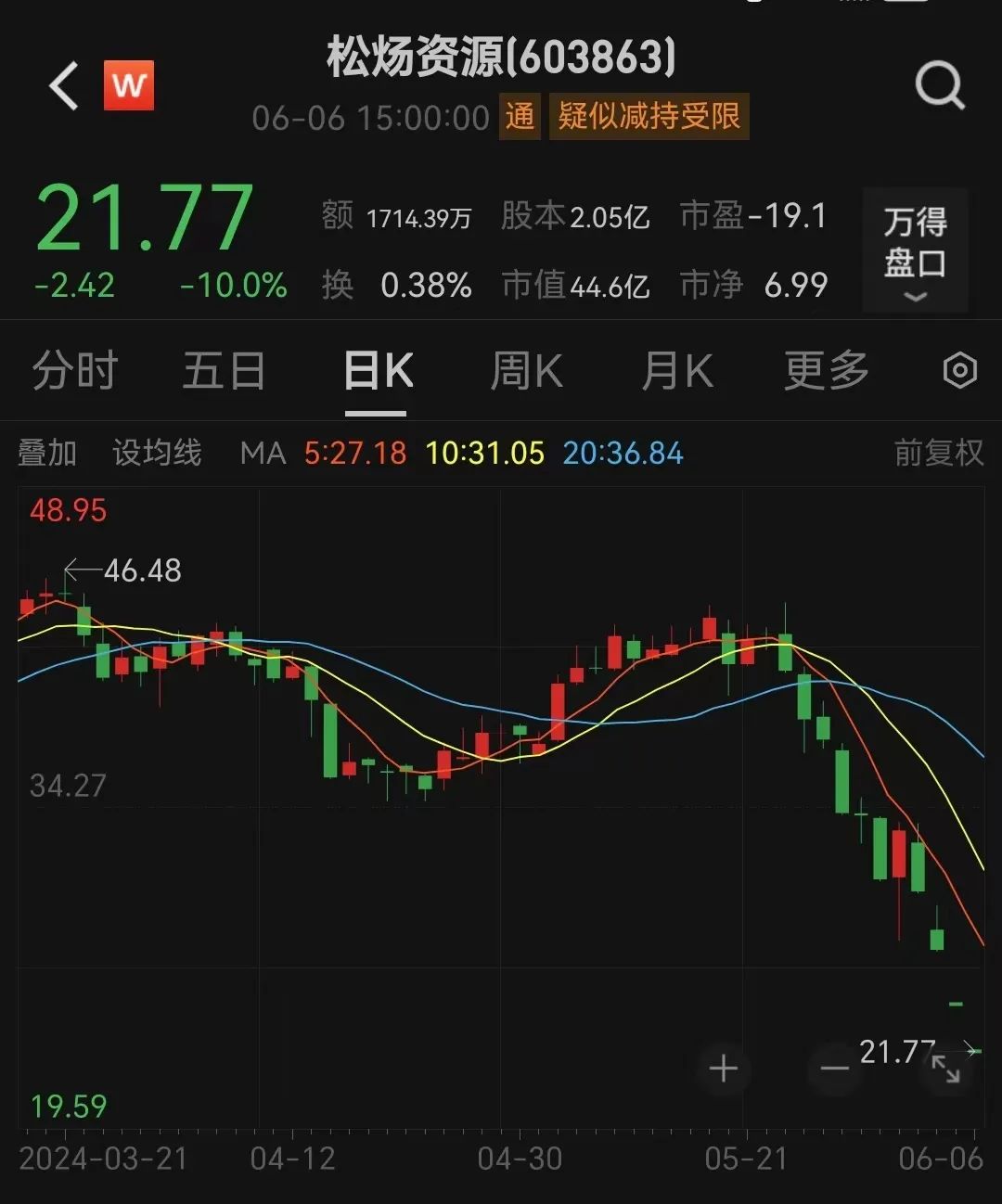 在此期间,松炀资源股价从5月23日至今暴跌达49.48%,近四个交易日更是连续跌停。