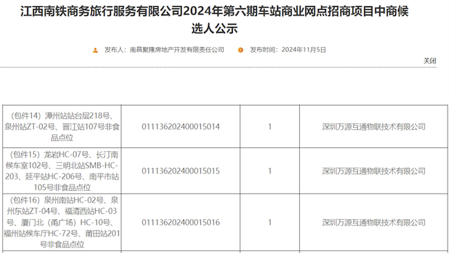江西南铁商务旅行服务有限公司2024年第六期车站商业网点招商项目中商候选人部分公示