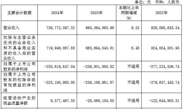 2024年,公司实现营业收入7.27亿元,同比增长9.23%;归属于上市公司股东的净利润为-2.36亿元,上年同期为-2.37亿元;归属于上市公司股东的扣除非经常性损益的净利润为-2.23亿元,上年同期为-2.36亿元;经营活动产生的现金流量净额为857.75万元,上年同期为-2,856.81万元。