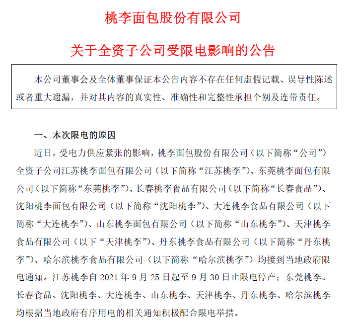 2021年9月底,桃李面包发布公告称,近日受电力供应紧张的影响,公司旗下江苏桃李、东莞桃李、长春食品等多家子公司均接到当地政府限电通知。